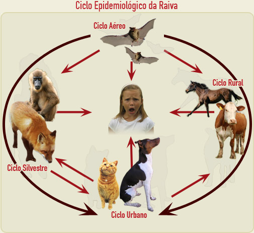 não há casos registrados com essa epidemiologia. Em áreas urbanas, é principalmente o cão (quase 85% dos casos), seguido do gato. Em áreas rurais, além de cães e gatos, morcegos, macacos e mamíferos domésticos como: bovinos, eqüinos, suínos, caprinos, ovinos. Os animais silvestres são os reservatórios naturais para animais domésticos.